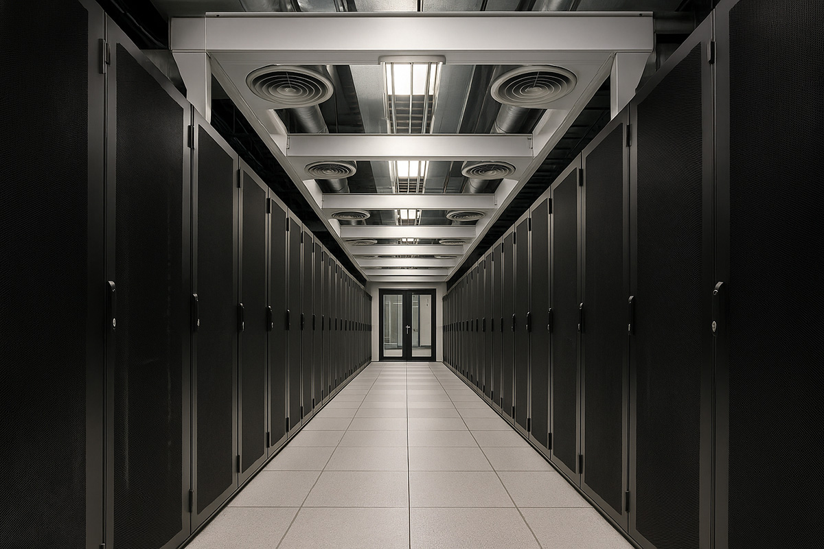 Modern data center aisle with server racks and cooling infrastructure, illustrating energy efficiency and sustainable operations in Canada